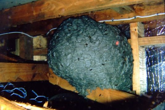 Nests in houses present a challenge to both deliver the powder and remove the nest. Nests in ceilings ideally should be removed as the decaying larvae may cause both a smell and a stain but most often this is not practical